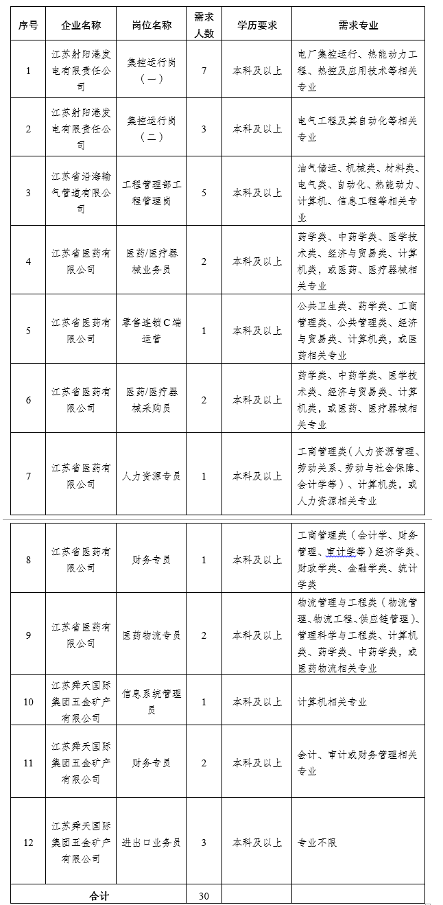 江苏射阳港发电有限责任公司、江苏省沿海输气管道有限公司招聘工作由集团统一组织;江苏省医药有限公司、江苏舜天国际集团五金矿产有限公司自行组织实施。