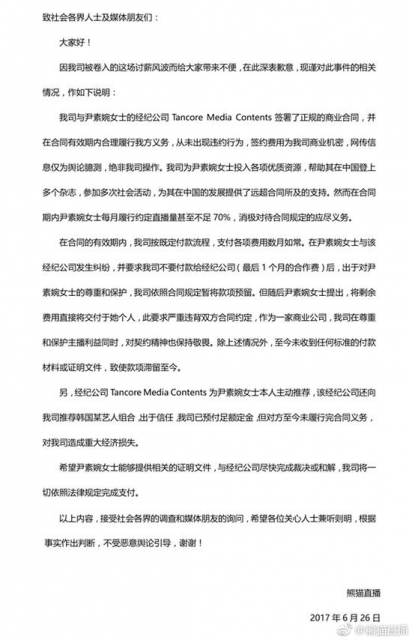 熊猫直播表示,此前与尹素婉女士的经纪公司Tancore Media Contents签署了正规的商业合同,并在合同有效期内合理履行我方义务,从未出现违约行为,签约费用为商业机密,网传信息仅为舆论臆测。