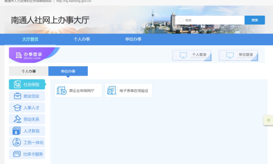 用CA账户登录网址:www.nthrss.cn,进入“南通人社网上办事大厅” 页面,依次点击“单位办事”——“人才新政”——“本科毕业生(技师)综合补贴申请”——“在线办理”,进入“南通市人社网上经办大厅(单位服务)”页面。
