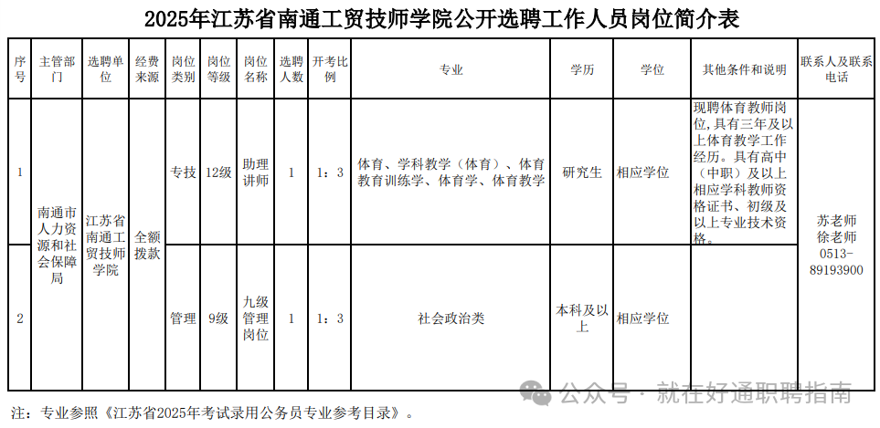 选聘岗位及各岗位选聘条件等详见附件:《2025年江苏省南通工贸技师学院公开选聘工作人员岗位简介表》(附件1,以下简称《选聘岗位表》)。《选聘岗位表》可在南通市人力资源和社会保障网(http://rsj.nantong.gov.cn)和江苏省南通工贸技师学院网(https://www.ntjsxy.com)查询。